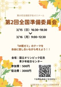【2準委の申し込みを開始します!】こんにちは!第69回全国医学生ゼミナール、第2回全国準備委員会 (以下、2準委) のお知らせです!◆2準委では、69医ゼミの開催地の発表に加えて卒年生の送り出しを行います! 69医ゼミの2回目の企画です!!皆さんの参加を心よりお待ちしています。今年の開催地は一体どこになるのか!?そして今までの感謝を込めて皆さんで卒年生を送り出しましょう!――企画詳細――第69回全国医学生ゼミナール第2回全国準備委員会■日時: 2026年3月15日 (日) 16:30~18:30、16日 (月) 9:30~12:3015日夜に交流会の開催を計画しております■場所: 国立オリンピック記念青少年総合センター■企画内容: 開催地の発表、現地紹介、卒年生の送り出し、等■参加費:500円■宿泊費:3000円■申し込み締切:宿泊必要な方は 3月6日(金)宿泊不要の方は 3月11日(水)――――――――申し込みはこちらから!https://forms.gle/VVhdt3ZbGitXJ2ZE8